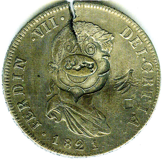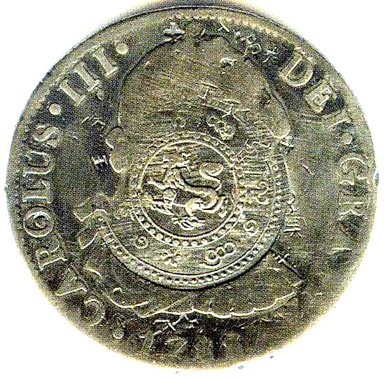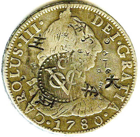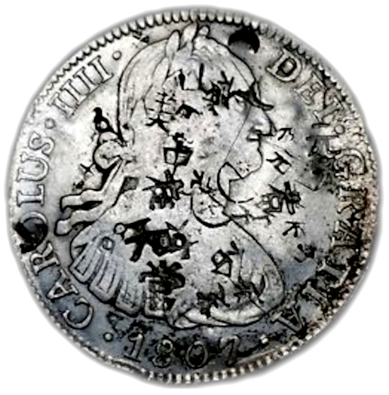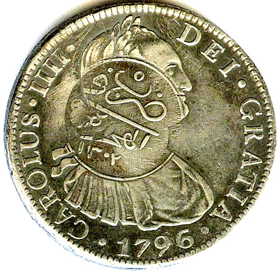 数世紀にわたって数百万枚のReal de a Ochoが鋳造され、19世紀まで広く使用されました。これらの硬貨には外国語の文字が刻印されることが多く、以下の例に見られるように、世界中の多くの国で法定通貨のように見えました。